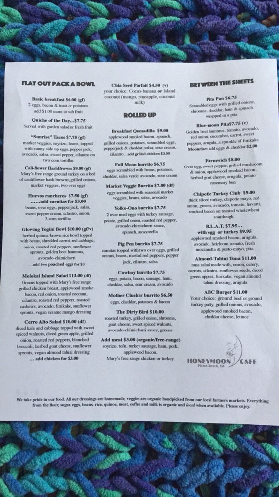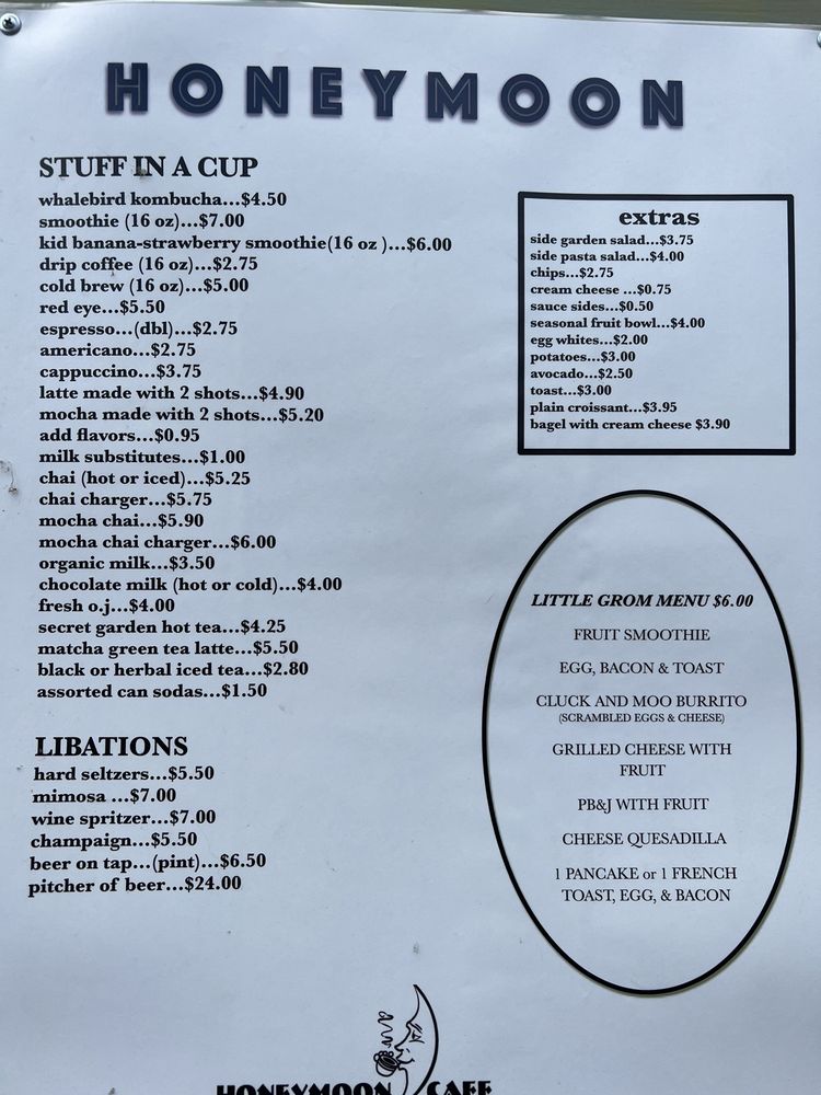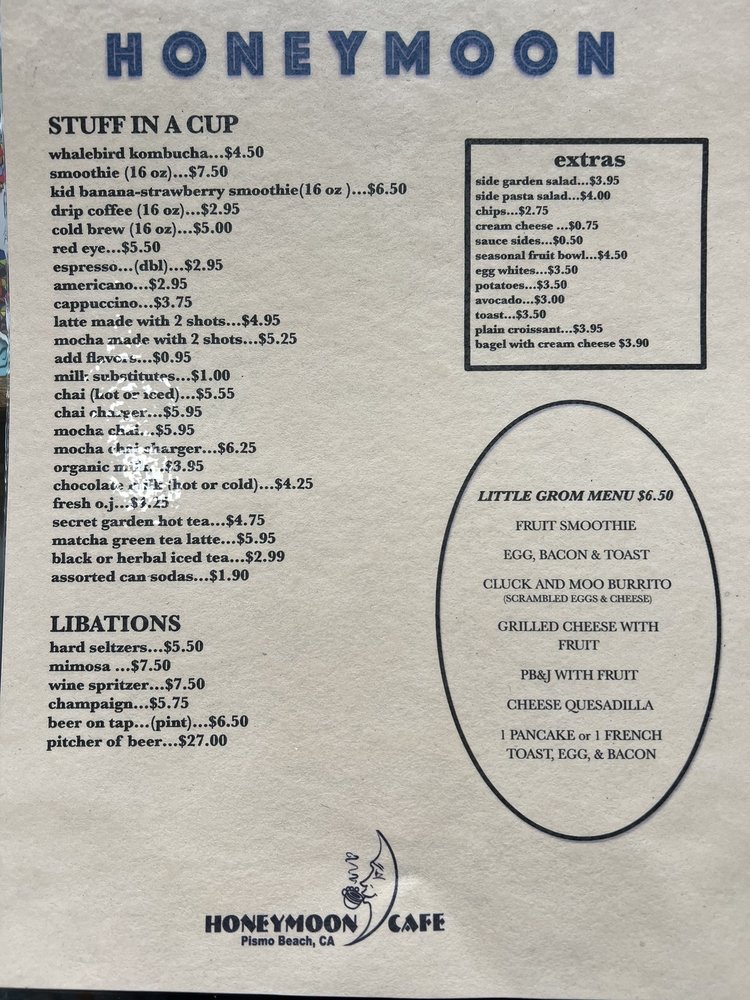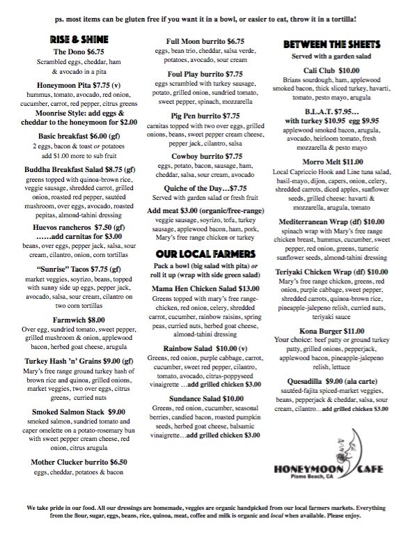 Introducing the menu at Honeymoon Cafe, a charming New American eatery in Pismo Beach, CA. Offering a delightful array of breakfast, brunch, and sandwich options, this restaurant caters to a diverse range of tastes and dietary preferences. With a strong focus on providing exceptional service and a warm atmosphere, Honeymoon Cafe stands out for its delicious and neatly prepared dishes. Customer reviews highlight favorites like the breakfast burrito, veggie breakfast bowl, and sunrise tacos. The cafe's unique and eclectic menu, combined with friendly staff and chic ambiance, create a memorable dining experience. Whether you're looking for a quick bite or a leisurely meal, Honeymoon Cafe's menu, setting, and service are sure to impress.
